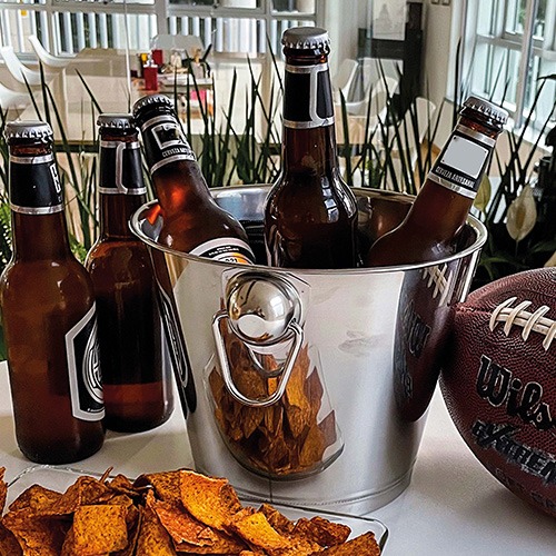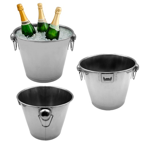 Hielera de acero inoxidable en forma de cubeta con asas y destapador.