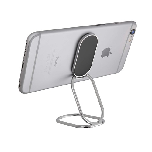 Soporte para smartphone o tablet con diseño plegable de dos brazos, ideal para ajustar en diferentes posiciones.