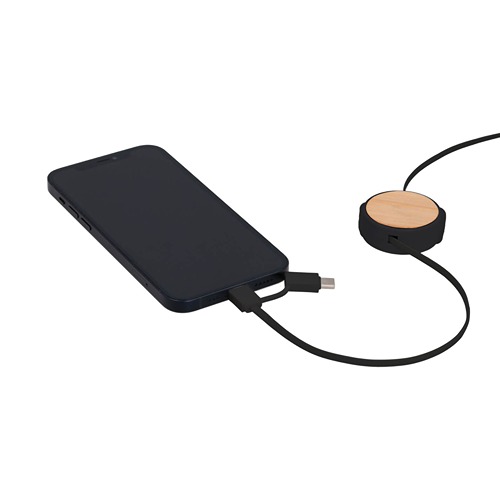 Cargador multifuncional circular con detalle de bambú, entrada tipo USB, tipo C, conector de salida tipo lightning y tipo C.