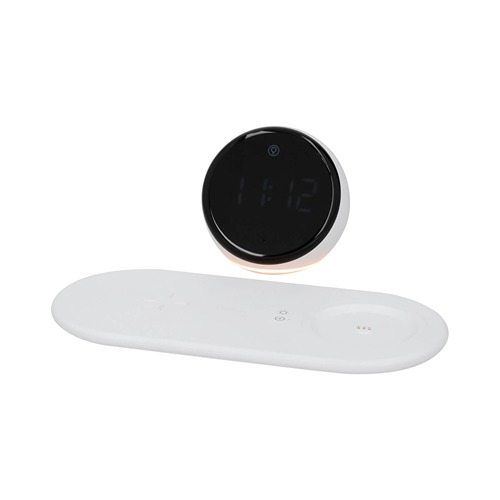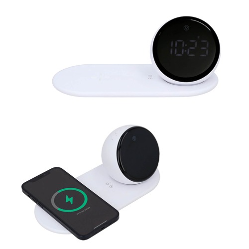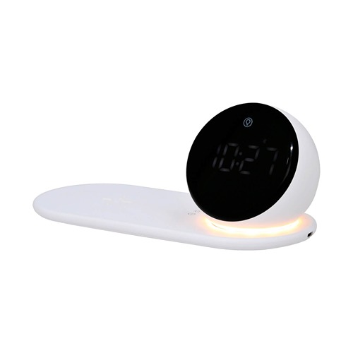 Cargador inalámbrico con alarma digital, bluetooth, bocina y lámpara de noche con tres modalidades. Incluye cable de carga tipo C.